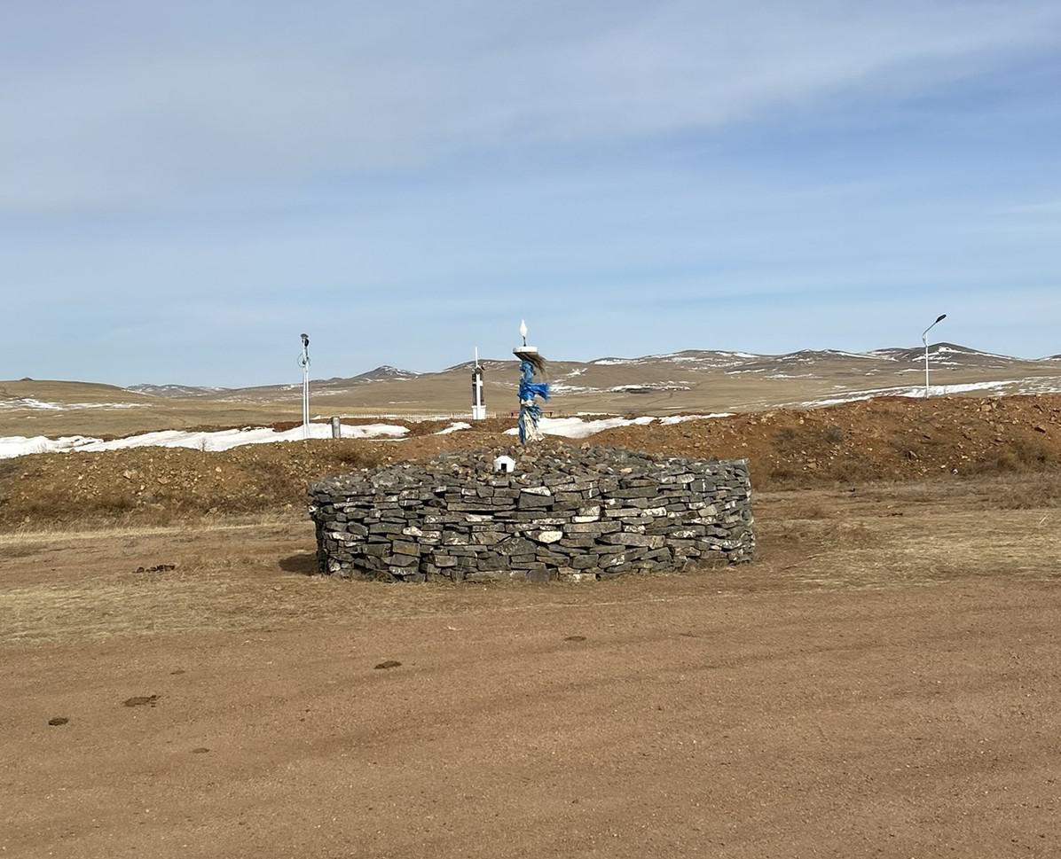 Construction: This ovoo is built with flat, layered stones native to the Khentii region, reflecting the rugged geology of the Eastern Steppe.