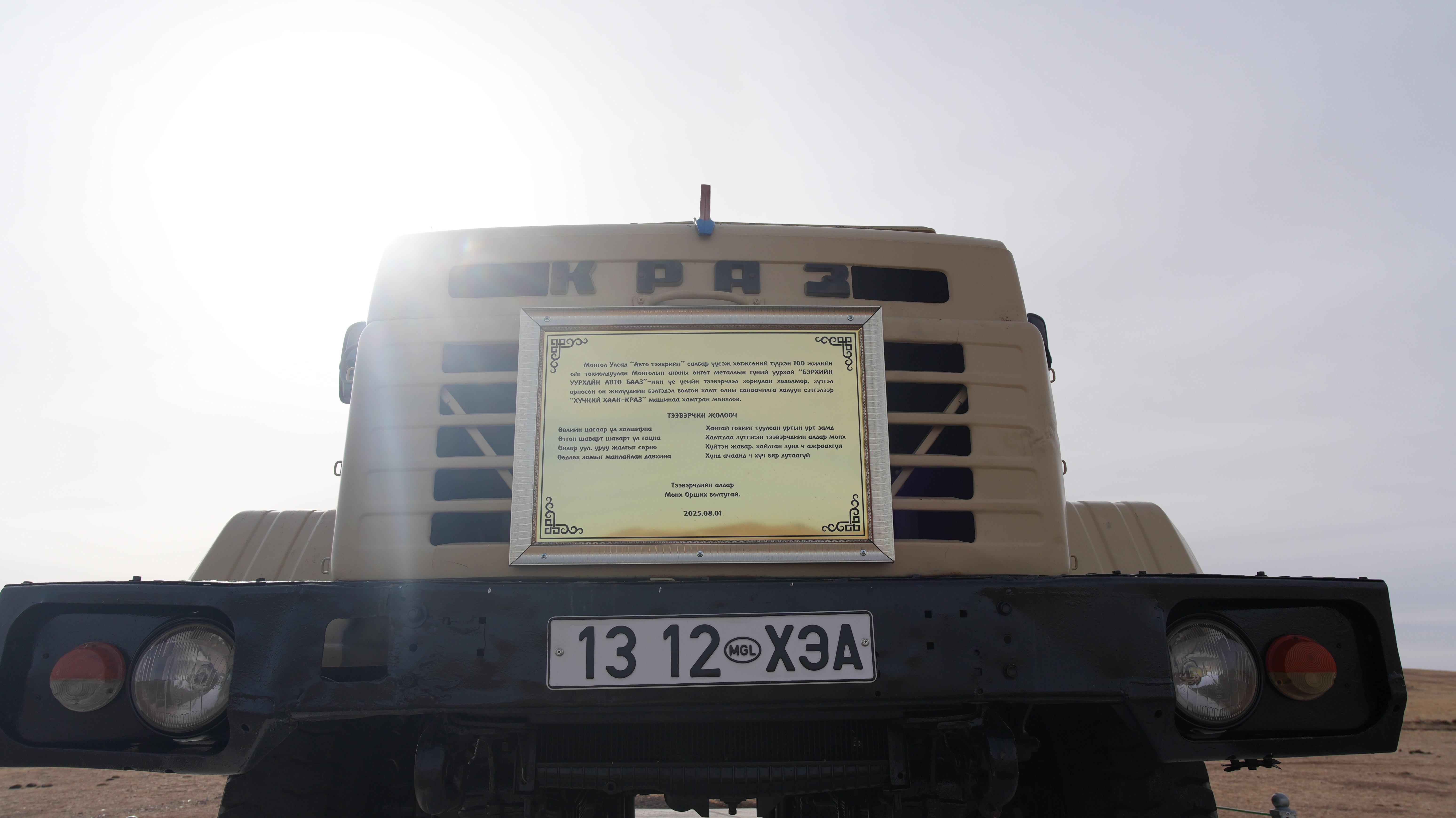 Commemorative Plaque: A golden plaque mounted on the front grill (dated August 2024) details the history of these vehicles and their role in the "Berkh Uurkhai" fleet, celebrating their service to the Mongolian national economy.