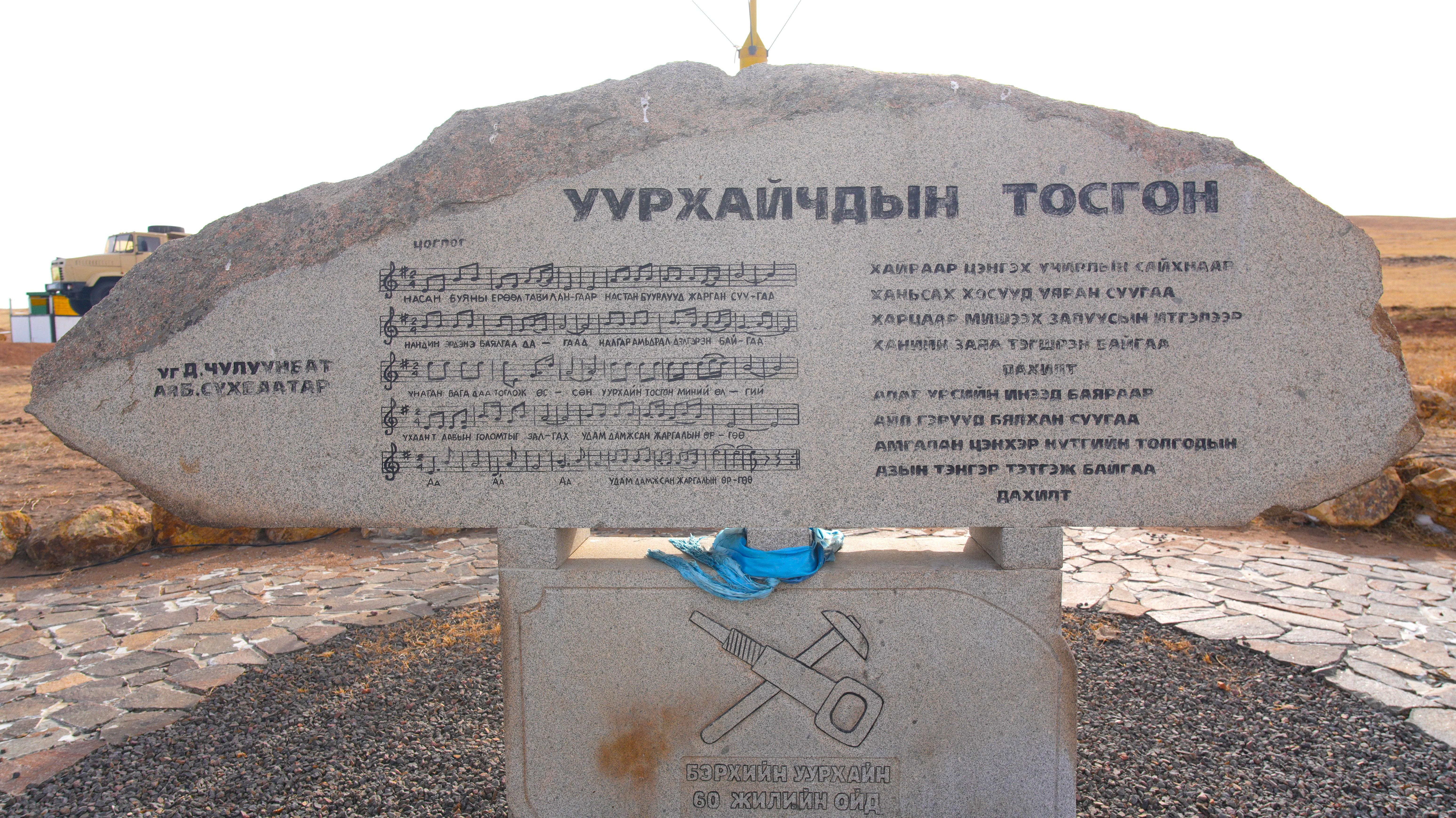 This large, natural-cut granite slab is engraved with the lyrics and musical notation for "Uurkhaichdyn Tosgon" (The Miner’s Village).