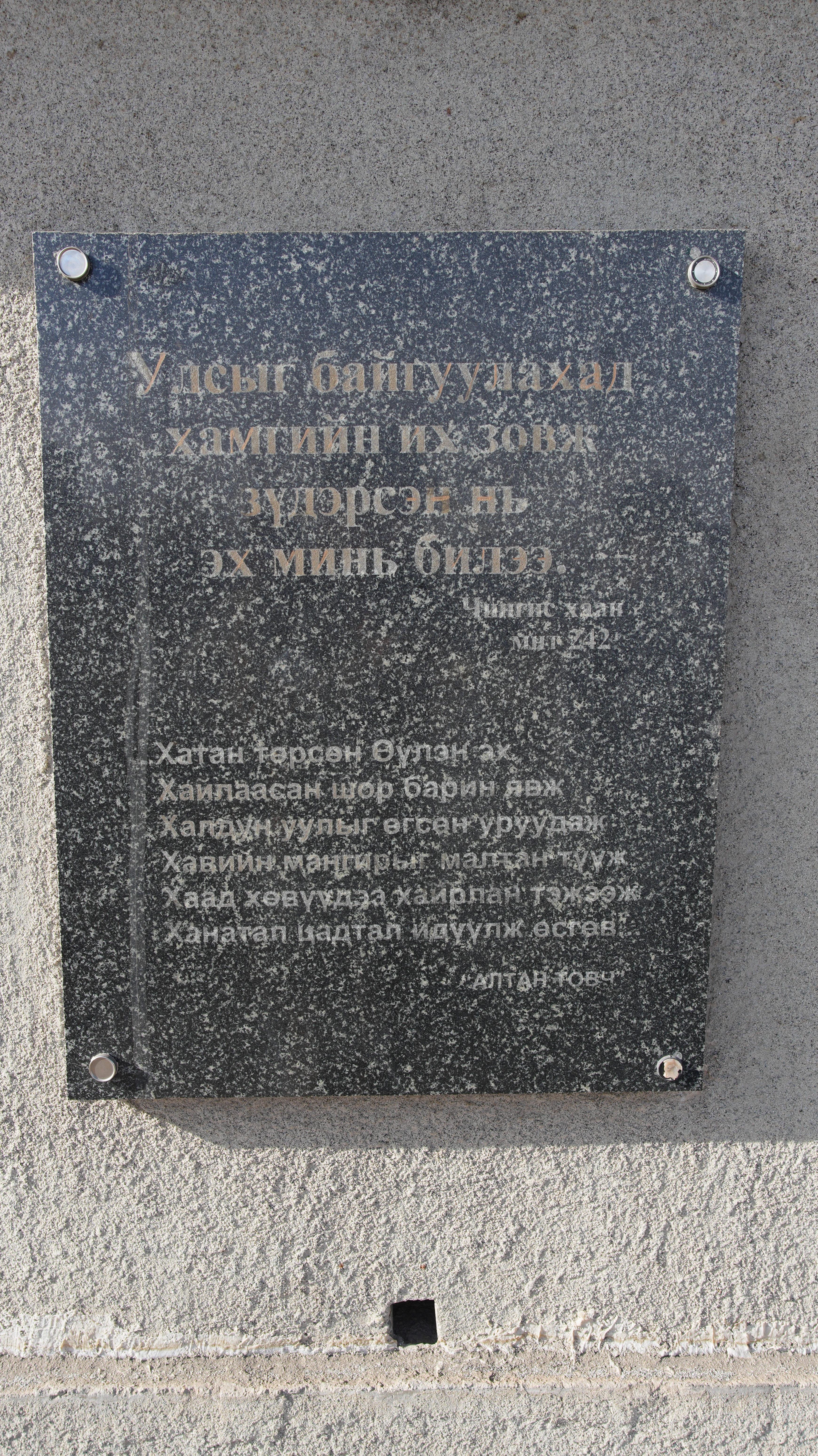 The black granite plaque on the pedestal is divided into two sections. It features a quote from the foundational Mongol epic, The Secret History of the Mongols, and a poetic tribute from the Altan Tobchi (The Golden Summary).
