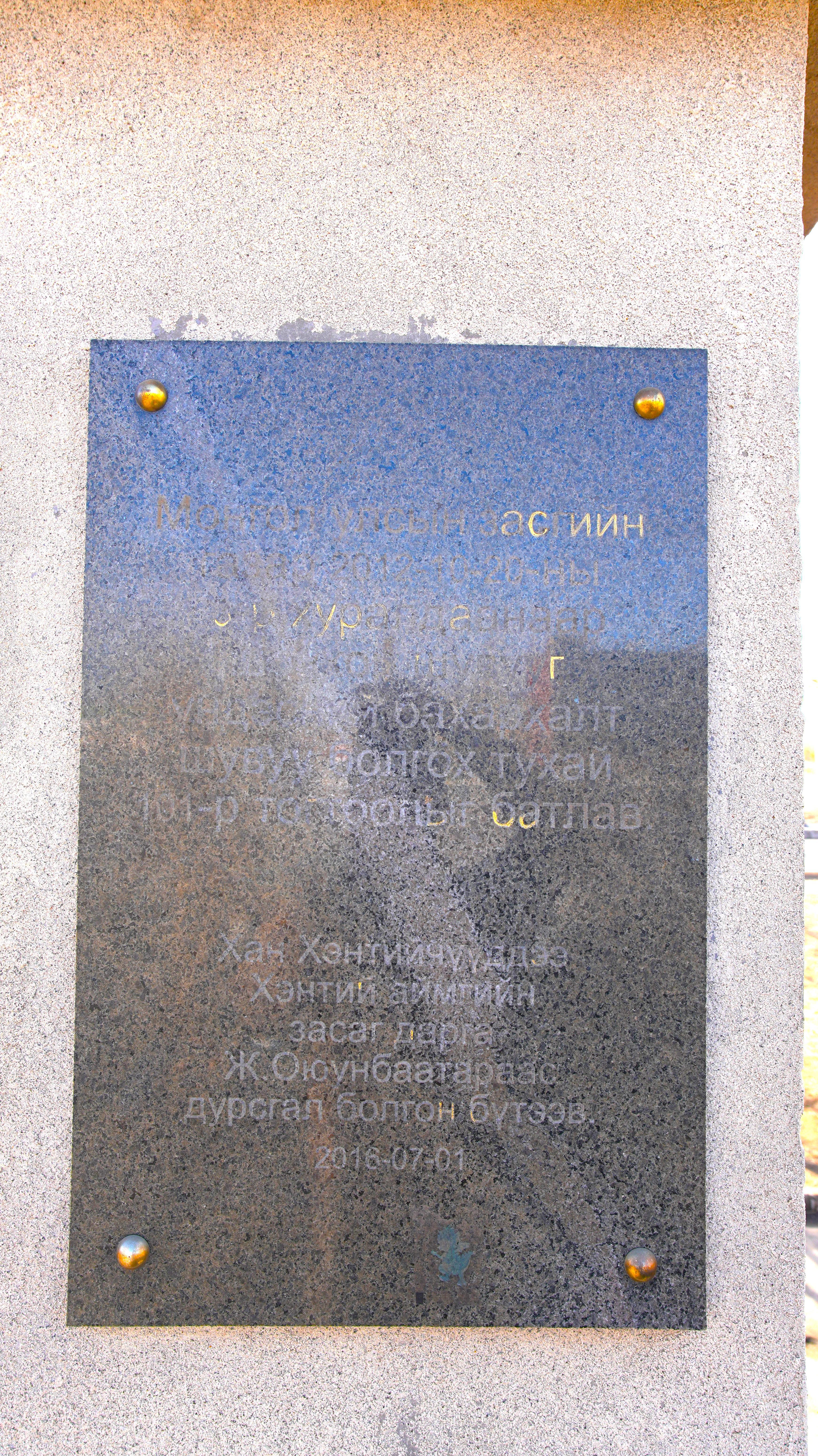 The black granite plaque provides the official context for the monument's creation. Here is the translation of the Mongolian text: