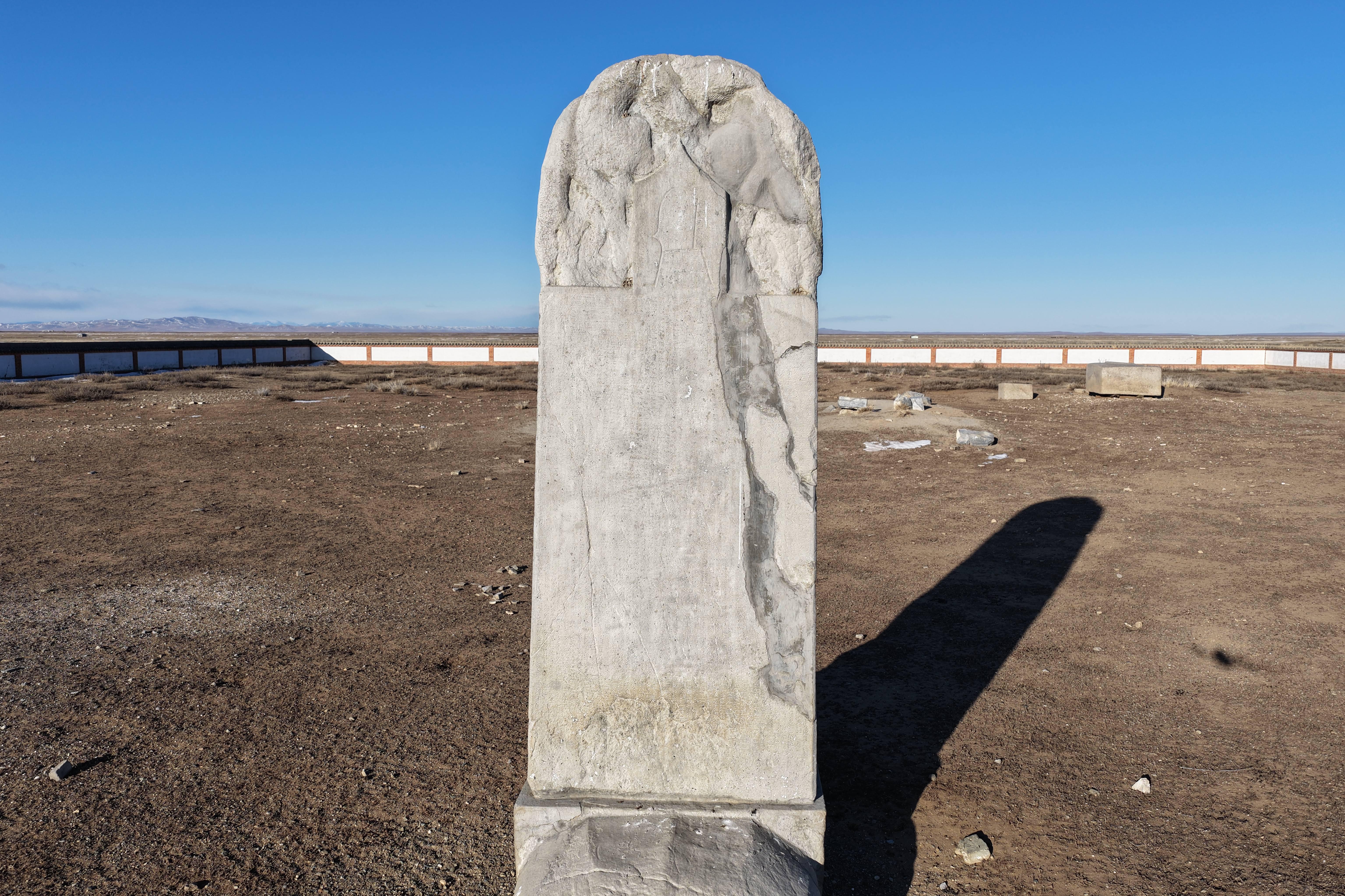 The Kul Tigin stele is a massive block of grey granite, approximately 3.3 meters tall.
