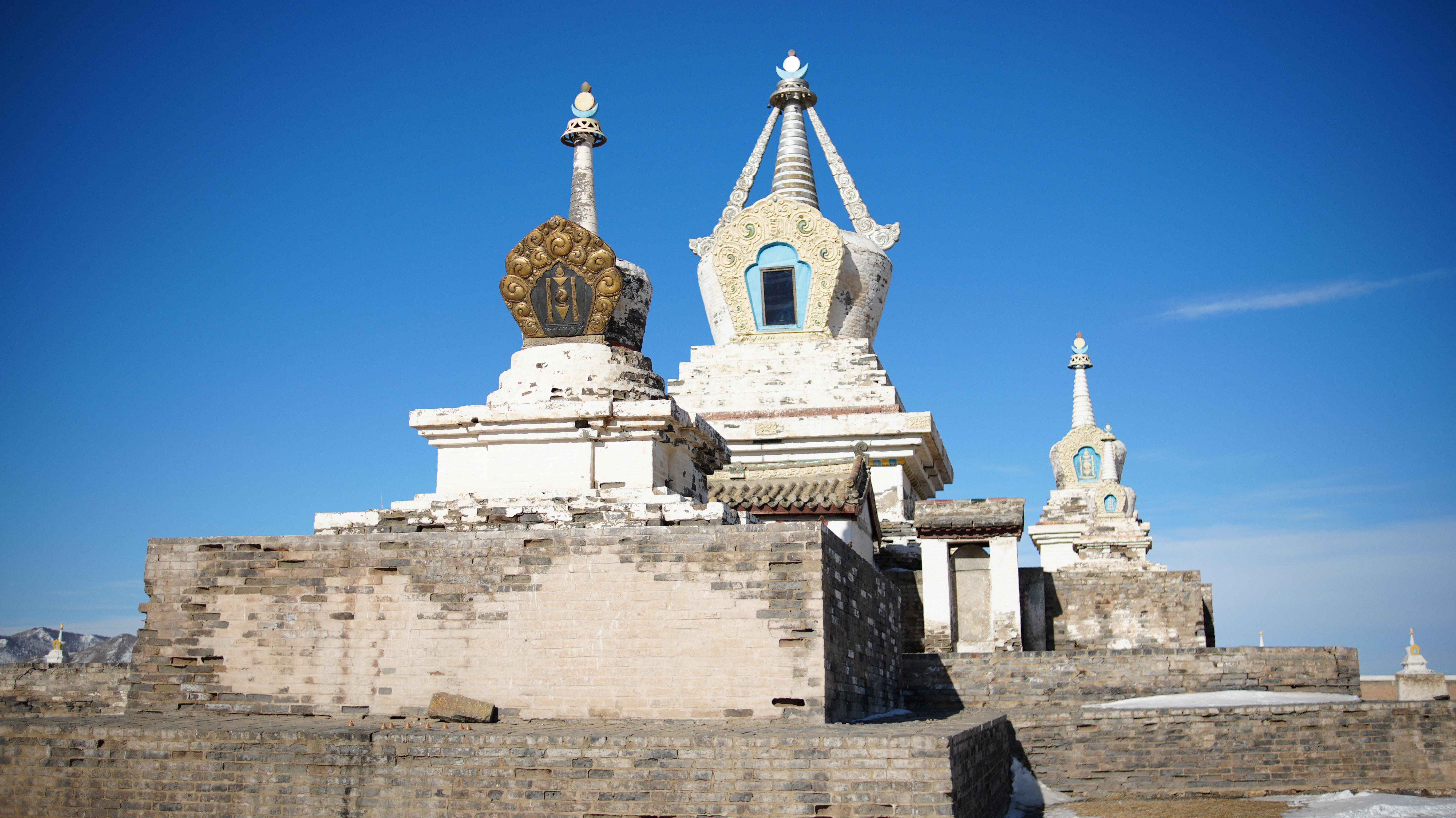 Architectural Legacy: The most striking feature of the monastery is its massive exterior wall, which is adorned with 108 white stupas—a sacred number in Buddhism representing the beads of a rosary. Many of the stones used to build the temples and walls were repurposed from the nearby ruins of Genghis Khan’s capital, Kharakhorum.
