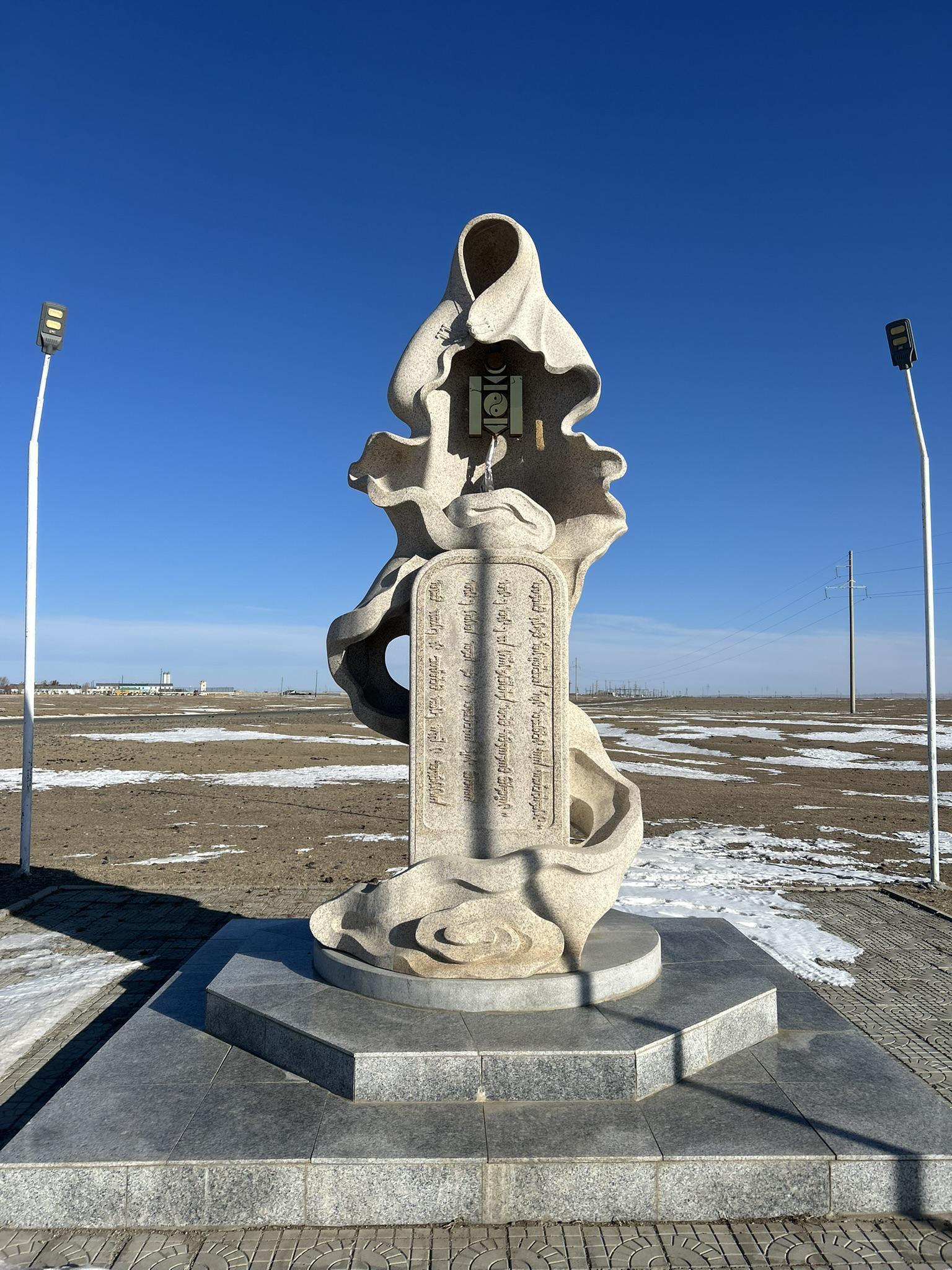 This striking monument stands as a testament to Mongolian identity, featuring the sacred Soyombo symbol cradled within flowing, wave-like stone carvings that represent the wind and the heavens. Below the emblem, a vertical stone tablet is meticulously inscribed with traditional Mongolian script, a writing system that dates back to the 13th century. Located against the vast, open horizon of the Mongolian landscape, the sculpture harmonizes ancient symbolism with modern artistic expression. It serves as a cultural landmark, honoring the enduring history, spirituality, and linguistic legacy of the Mongol people.