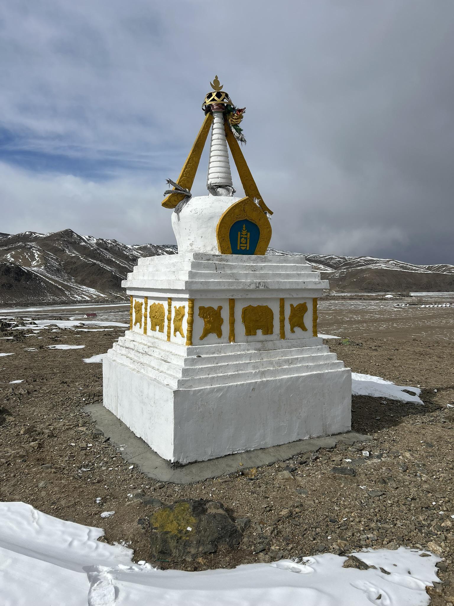 The structure features four small golden lion-like figures at its corners, known as snow lions, which symbolize fearlessness and the protection of the Dharma. Located in the historic region of Karakorum, where the ancient and modern worlds meet, this stupa serves as a site for circumambulation—a practice where believers walk clockwise around the monument to accumulate merit and find inner peace. The surrounding landscape, dotted with patches of spring snow and framed by the "Eternal Blue Sky," emphasizes the deep connection between Mongolian spirituality and the natural environment.